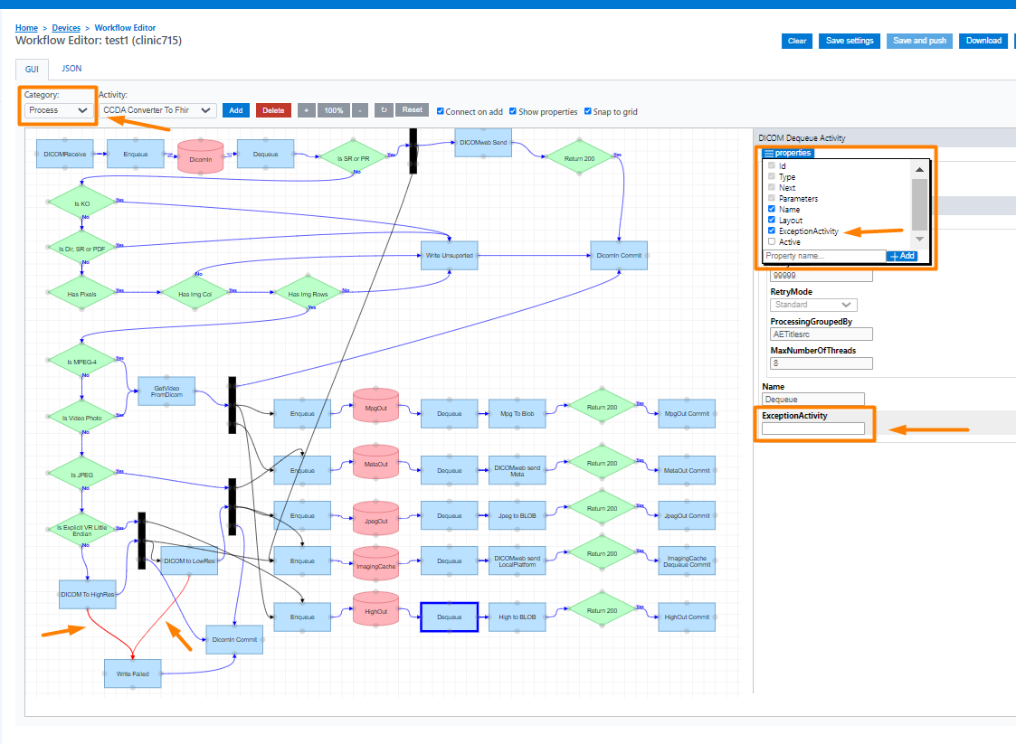 A new property has been added that defines an ExceptionActivity inside the Activities. Visually it will be displayed as a red arrow. To add it, select an activity block, open the activity properties and select the ExceptionActivity checkbox. This will show an input text to enter the value.