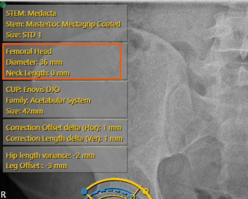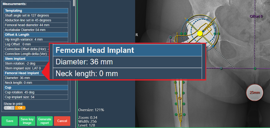 Data on the femoral head implant are already available in the hip information table and in the “show in print” box.