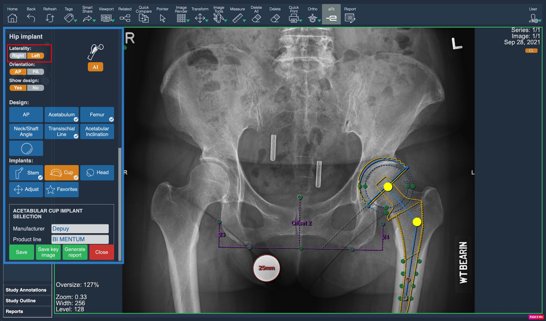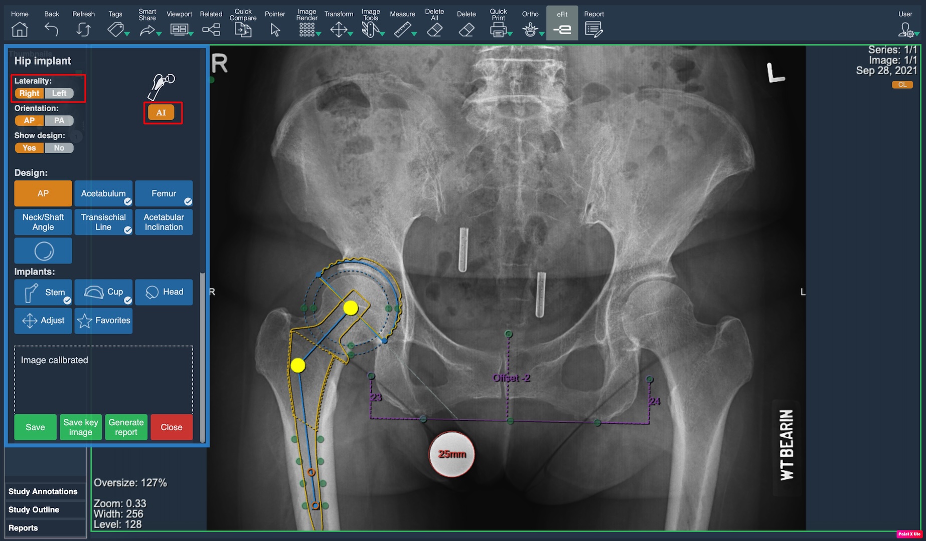 This enhancement allows instantaneous change of the laterality of the hip implant without performing another AI run.