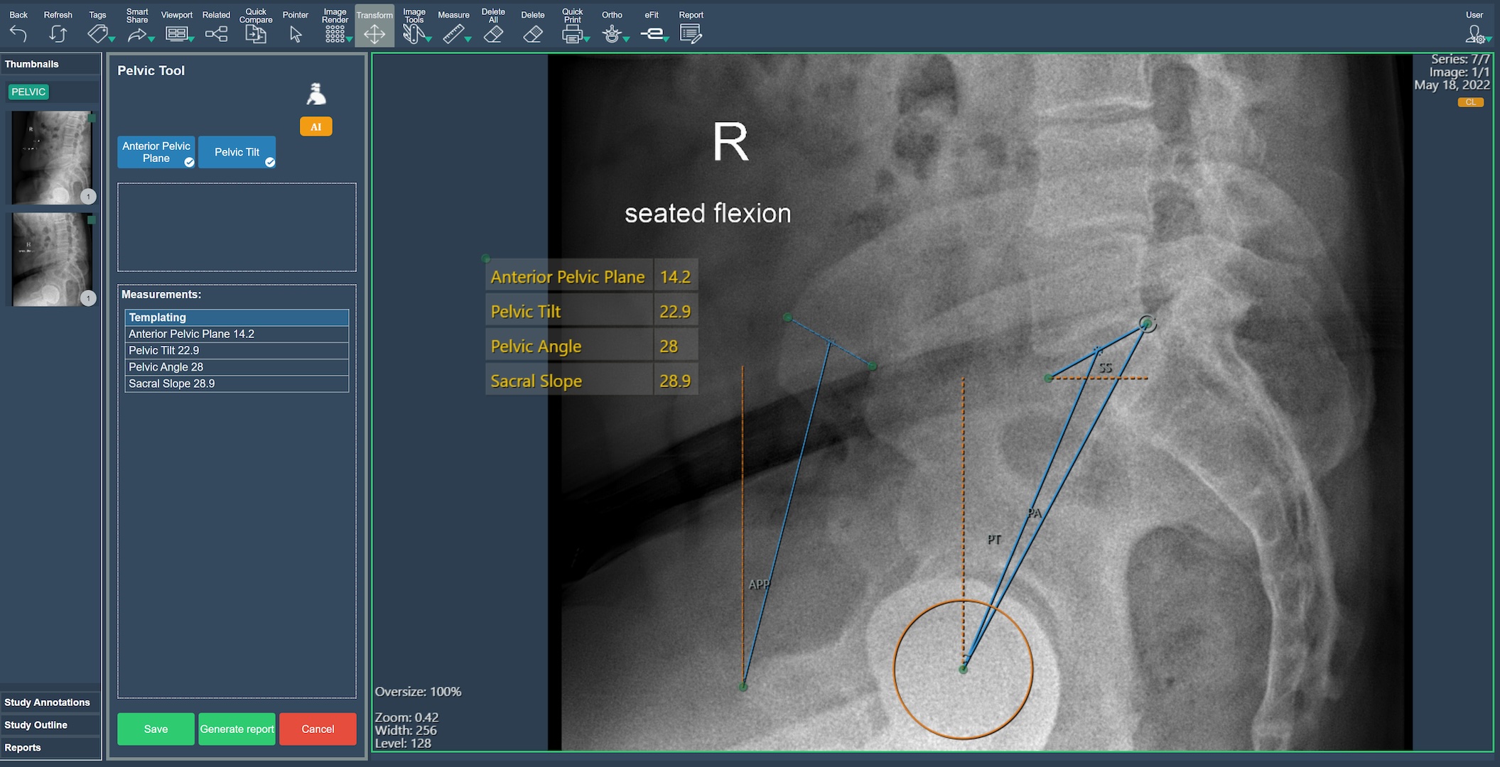 - Description: The Pelvic Tool will be an eFit tool used to determine the inclination of the hip (anterior pelvic plane and sacrum) based on anatomical points entered manually or based on detection with an AI algorithm.