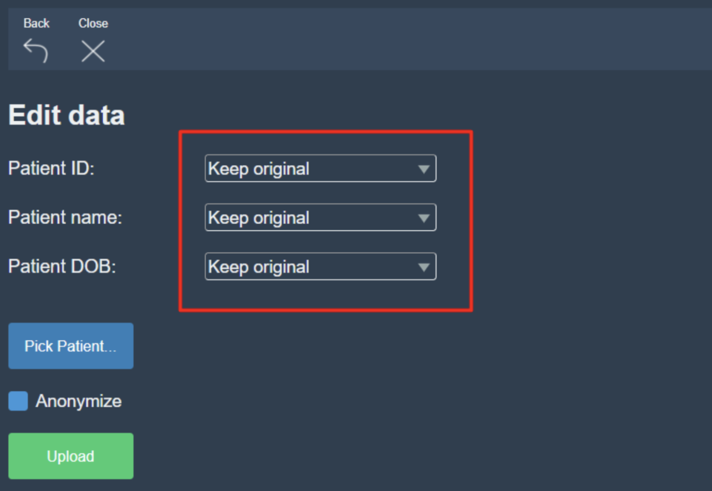 - Upload, keep original: In the upload option, the edition of demographics allowed three options: empty, select from one of the studies, or replace with custom text. However, it was not possible to keep the original values when the demographics differ among multiple studies. We added a "keep original option", as shown.