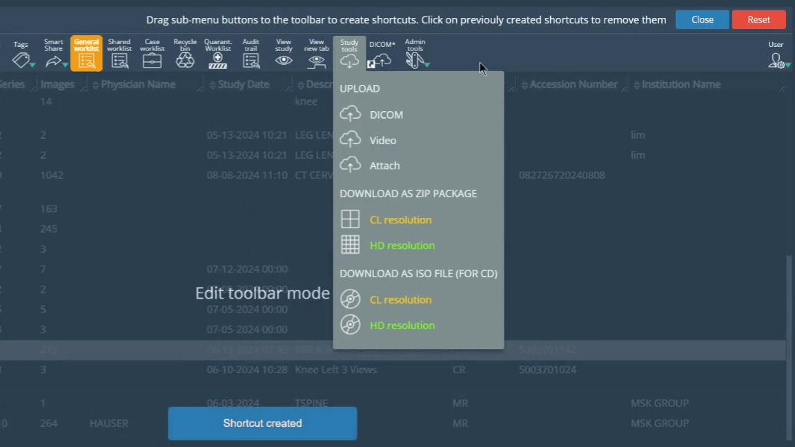 The context menu for studies sent to the quarantine list has been enabled. The user can now have the tools and functionalities defined in settings also in these studies. The context menu will be displayed by right clicking on the viewport.