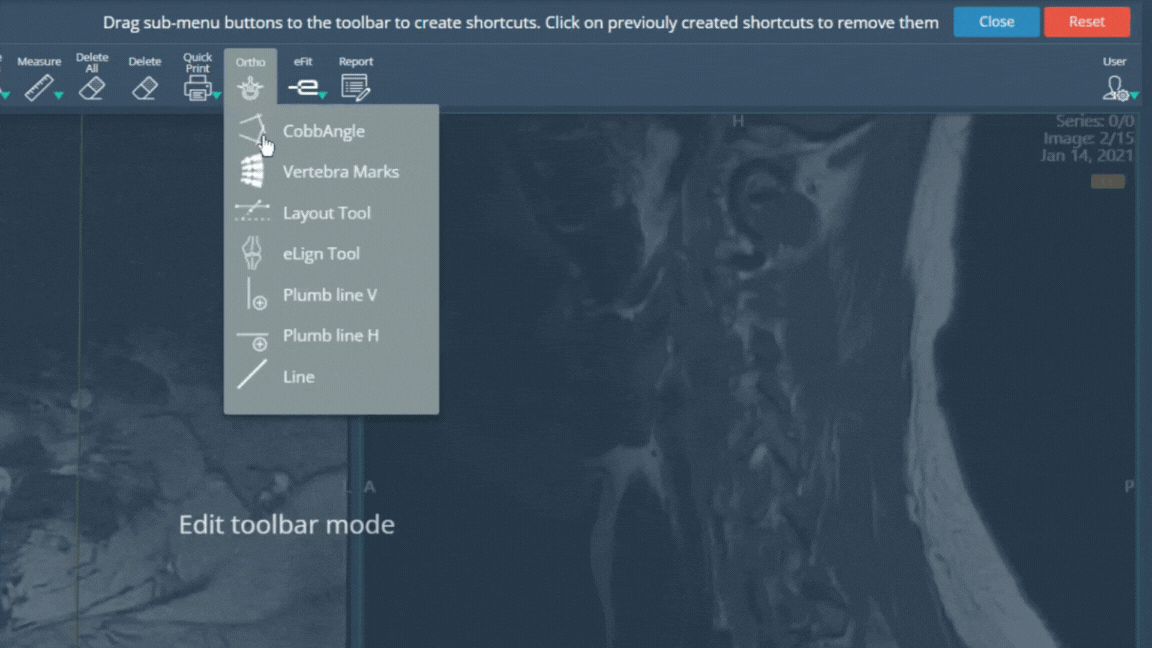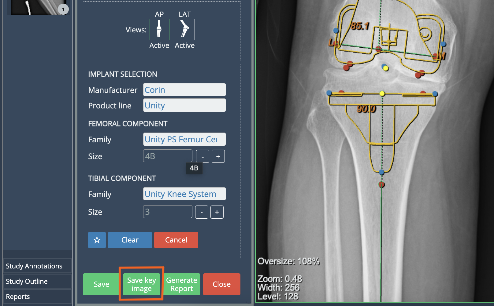 The "Save key image" option has been added for knee to generate key images directly. This access allows to save implant options while using the eFit tool and then continue modifying the current one.
