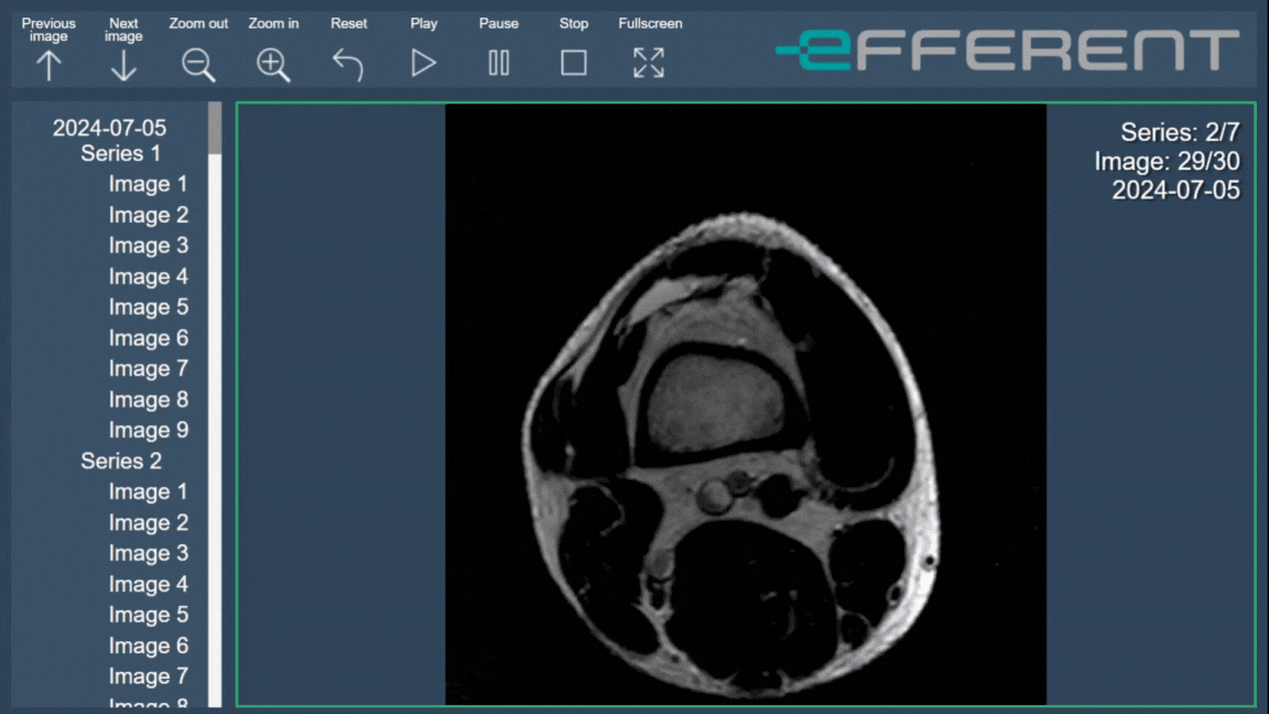 Automatic playback of images with the Cine tool was enabled in the CD viewer, available with the download of a study as an ISO file. In the toolbar the user will find the Play, Pause, and stop buttons to use this functionality.