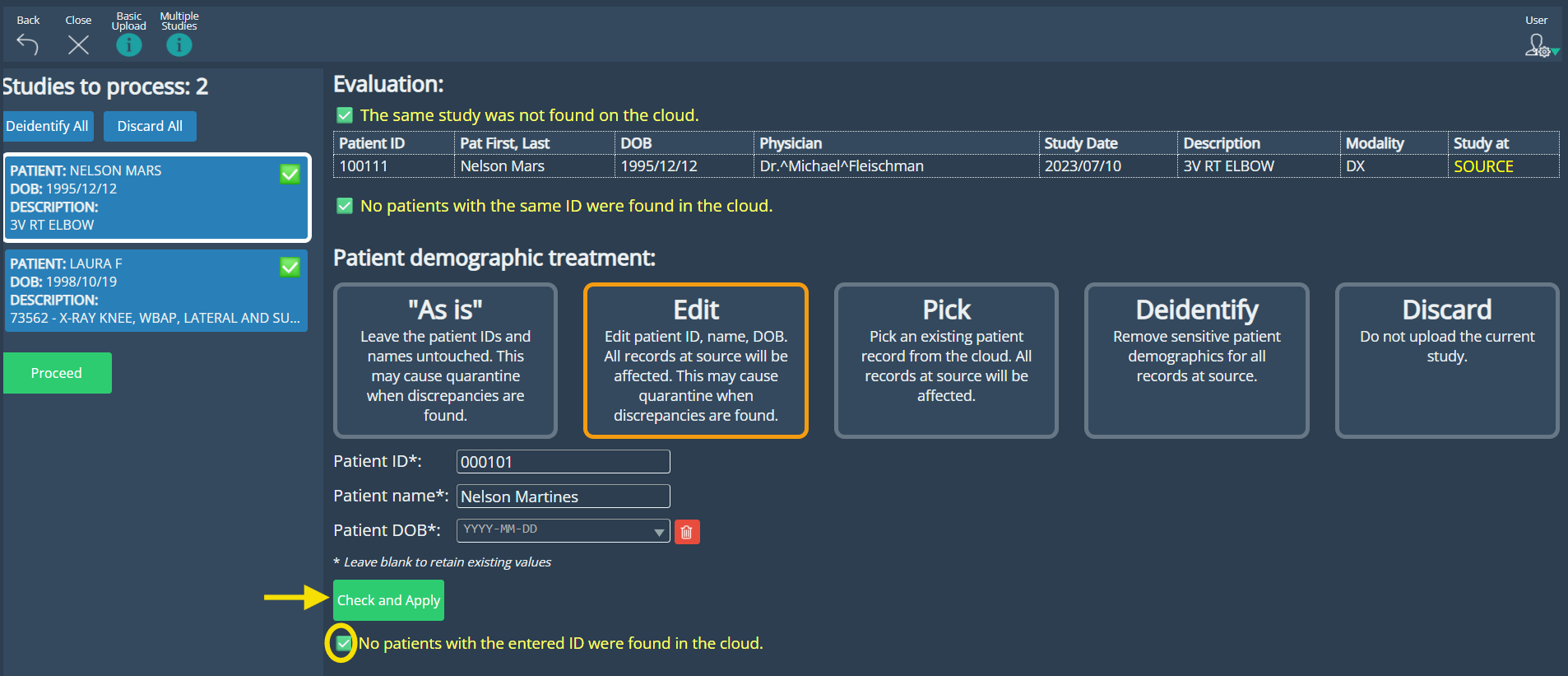 Users can easily update study details and choose how to handle patient data using options like As Is, New, Edit, or Pick. The improved interface simplifies the process with a clearer layout and responsive guidance. When creating or editing a patient, the system automatically checks for existing records based on the entered Patient ID and notifies the user if a match is found, helping maintain data consistency and avoid duplicates.