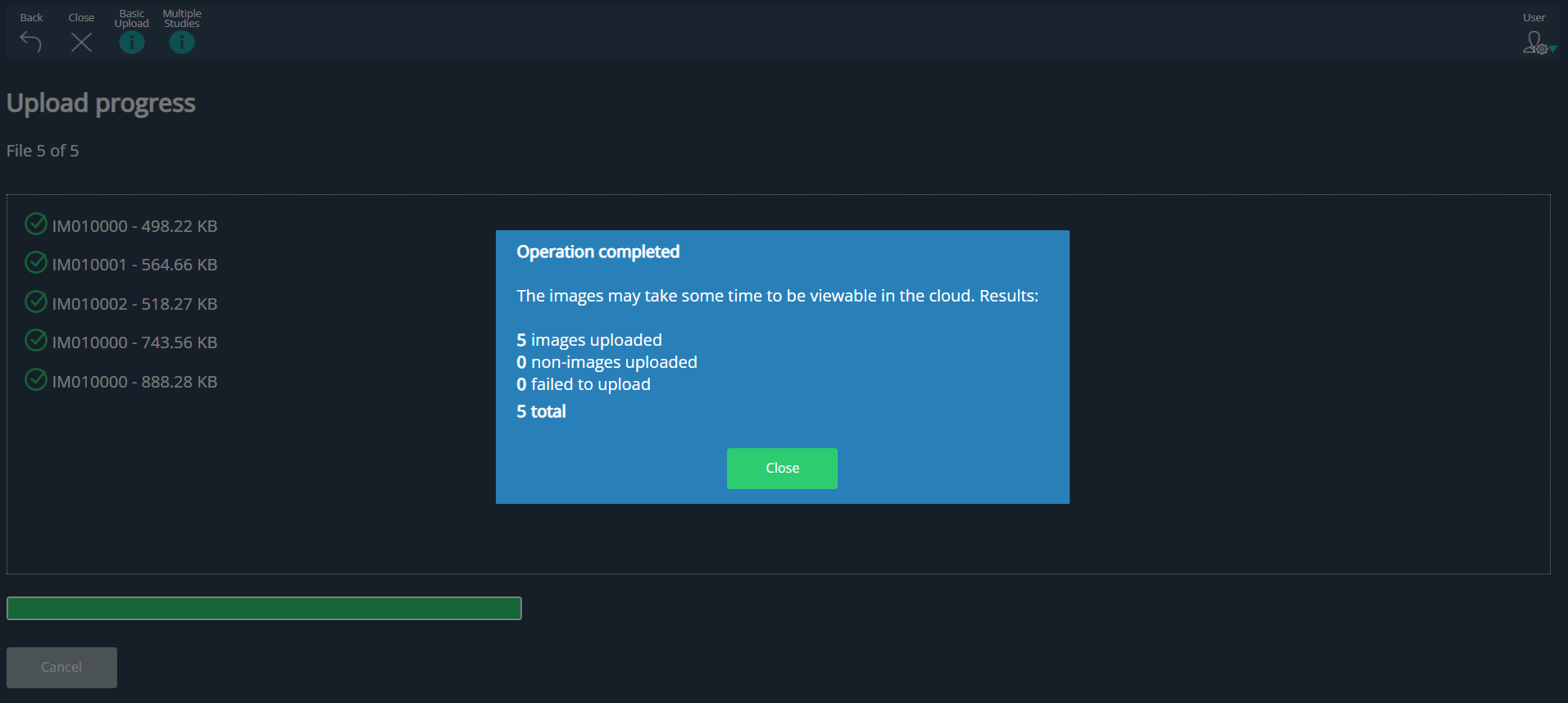 After completing an upload, users receive a detailed summary report on screen. This report includes the number of image instances successfully processed, any failures, and total count of non-image instances.
