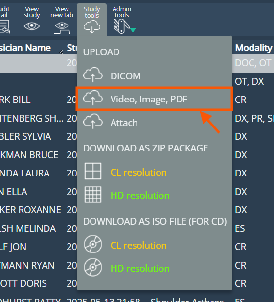 The upload functionality has been extended to support additional file types, including PDF and image files (JPEG, JPG, PNG). Previously, only DICOM and video files were supported. When uploading these new file types, users are required to manually provide key patient information—such as Patient ID, Name, and Date of Birth—in order to generate the study record and enable visualization of the uploaded content.
